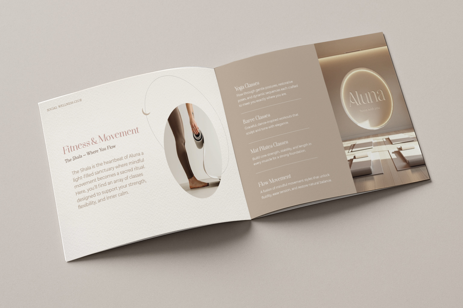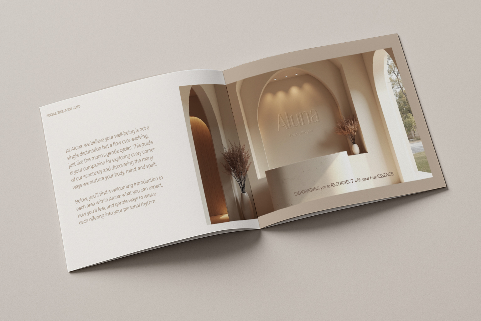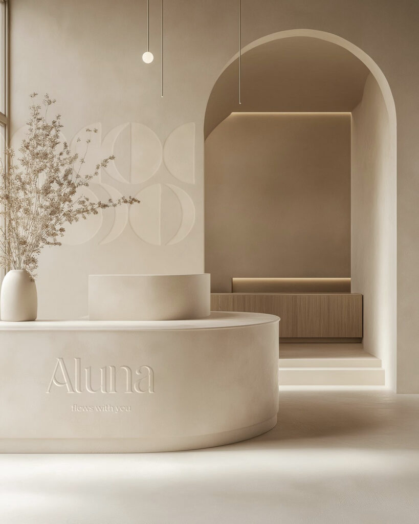 Se diseñó un universo gráfico propio inspirado en la esencia de la marca, donde las curvas suaves y las líneas orgánicas construyen un lenguaje visual fluido y delicado. Este sistema gráfico transmite serenidad, cercanía y equilibrio, reforzando el carácter sensible y femenino de Aluna. La propuesta se apoya en una paleta cromática de tonos neutros, que aporta calma, armonía y un enfoque de lujo silencioso, alineado con una estética sofisticada y atemporal.